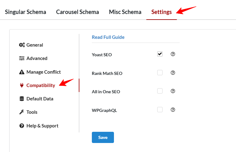 Schema Package includes compatibility options with popular SEO plugins, headless setups, and other third-party tools. These settings ensure smooth integration and consistent schema values across your site.